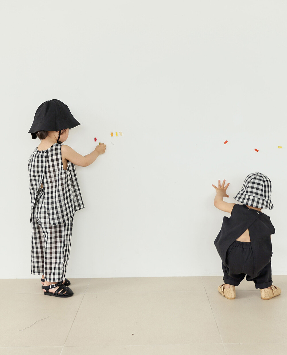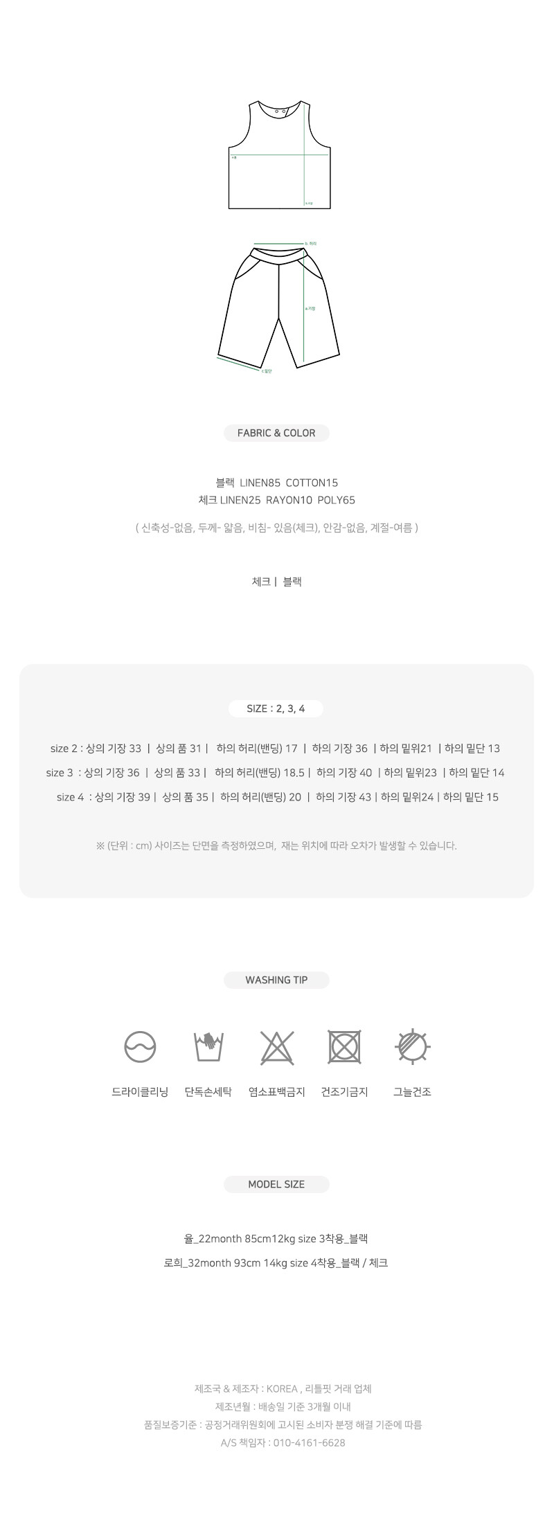 블랙 색상과 체크 원단은 원단 촉감이 달라요! 체크 원단이 좀 더 시원한 촉감의 레이온이 더 함유되었고 좀 더 빳빳하고 모시느낌(?)이 나며 , 더 얇아 비침이 있어요! 빳빳함은 세탁 할 수록 유연해지는데 너무 피부가 예민한 아이는 피해주세요!(모델 아이들과 여러명의 샘플 피팅 아이들은 아무도 거리낌 없었지만 그래도 처음 받아보실 때 빳빳하다!! 느끼실 수 있어요)